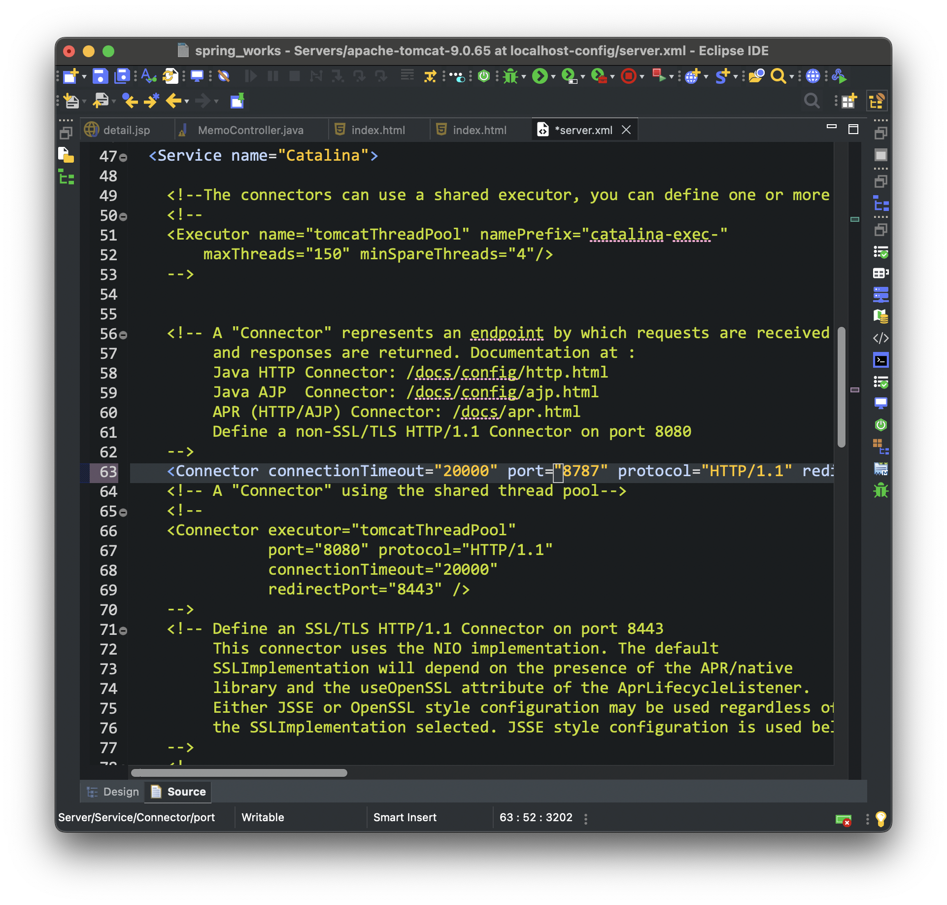3. server.xml 의 63번째 줄에서 port 번호 안겹치게 바꾸기