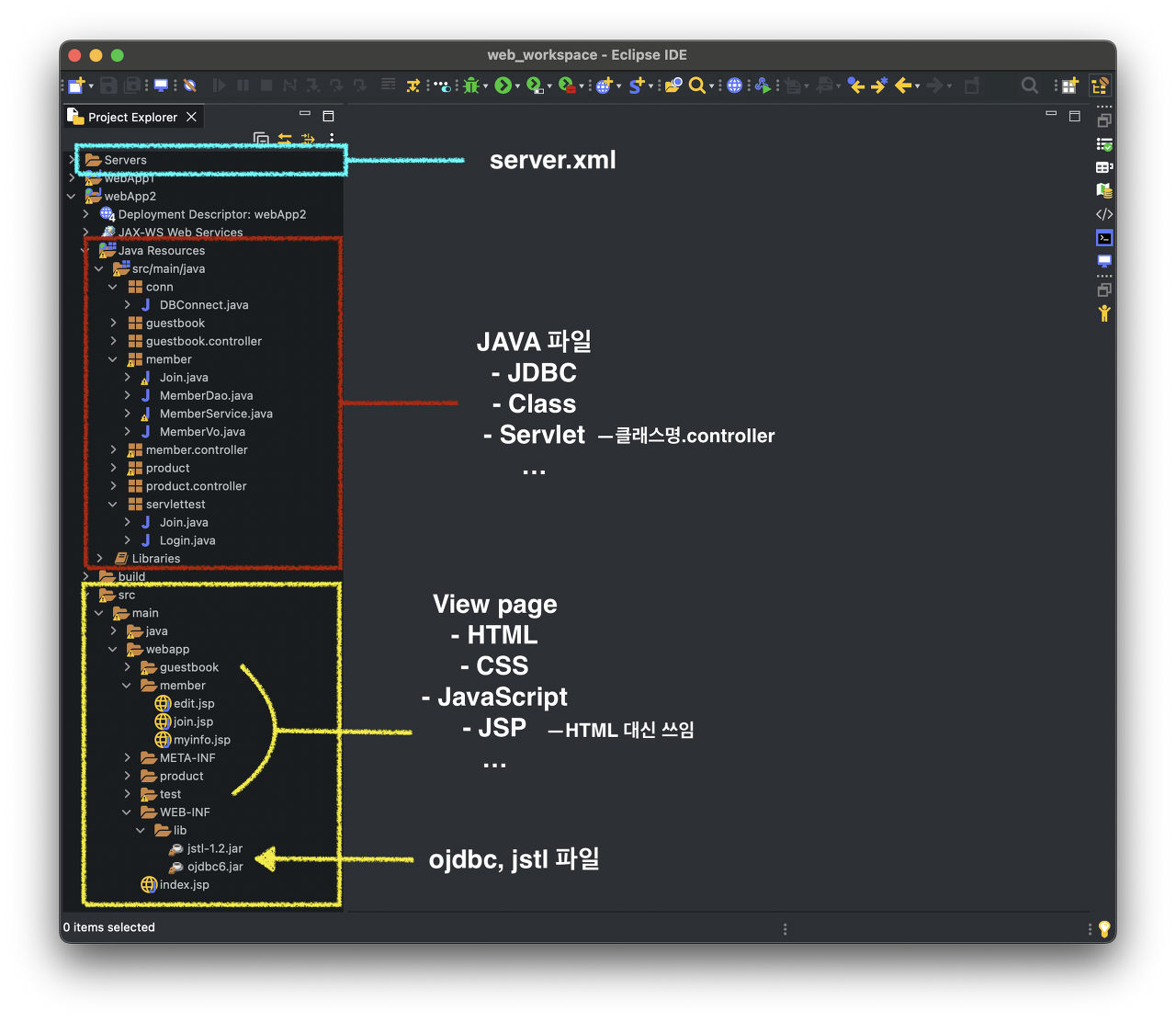 웹 서버 페이지 - Servlet, JSP는 웹 서버 페이지이다. (톰캣과 같은 웹 어플리케이션 서버(WAS) 필요함) - 웹 페이지는 url로 접근 -- 각 페이지는 접근할 수 있는 url을 가져야 함. - JSP는 webapp 폴더가 /