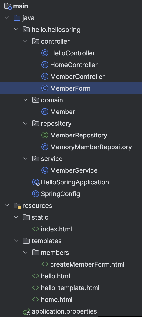 재밌는(?) 점은 김영한 쌤은 MemberForm을 따로 패키지를 안만들고 controller에 넣었다는 점이다.