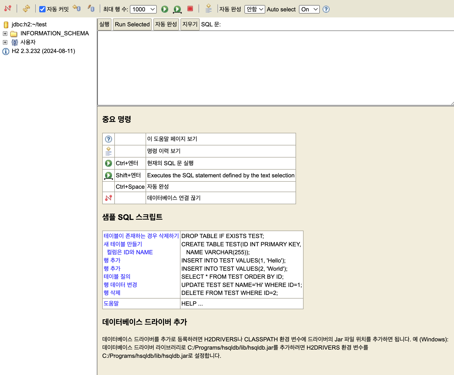- 개발이나 테스트 용도로 가볍고 편리한 DB, 웹화면 제공