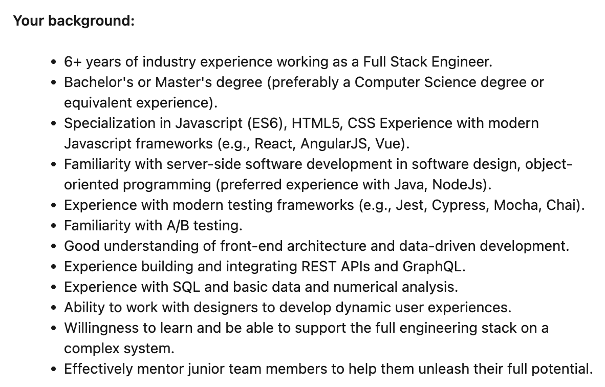 시니어 풀스택 디벨로퍼 자격조건을 보면 "preferred experience with Java, NodeJs" 라고 적혀있음.