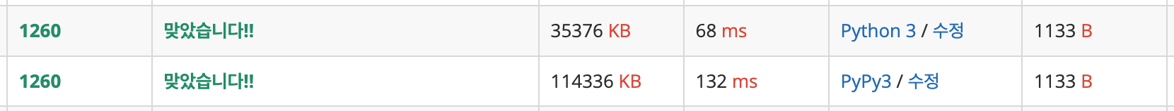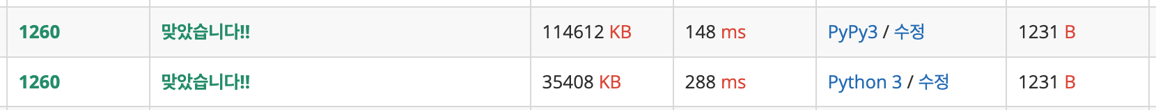 근데 ; Pypy로 제출하니까 속도가 100ms 나 줄었는데 메모리가.. 거의 세배를 .. 씀..