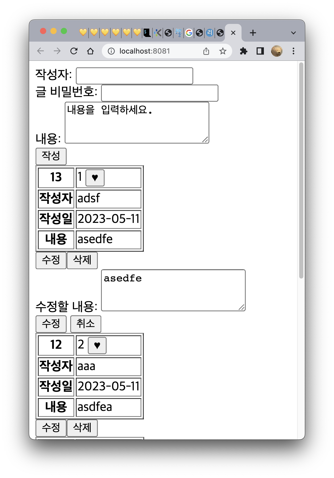 (수정폼의 수정버튼은 수정완료. 취소버튼 누르면 수정폼 사라짐)